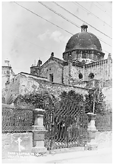 Figura 2 Entrada al jardín botánico del Instituto Campechano, al fondo la cúpula del extemplo de San José (Fondo Alcocer Bernés, Archivo General del Estado de Campeche).