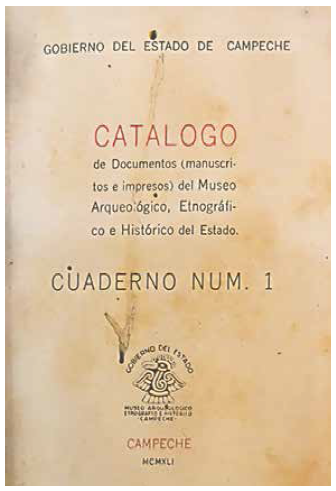 Apenas un mes después de la inauguración del museo, en septiembre de 1941, el Gobierno del Estado dio a luz la primera publicación sobre el naciente archivo adscrito al recinto, el Catálogo de Documentos (manuscritos e impresos) del Museo Arqueológico, Etnográfico e Histórico del Estado (1941) (Figura 8). Con este impreso se dio inicio a una serie denominada “Cuadernos” que, para septiembre de 1943, al final del cuatrienio de gobierno de Pérez Martínez, ya sumaba los siguientes títulos: Viaje arqueológico a los Chenes por Gustavo Martínez Alomía; Tasaciones de los pueblos de la Provincia de Yucatán pertenecientes a los encomenderos de la Villa de San Francisco de Campeche, hechas por la Audiencia de Santiago de Guatemala en el mes de febrero de 1549; La introducción de la imprenta en Campeche de Juan de Dios Pérez Galaz y Tres cédulas reales, editadas por el propio gobernador.28