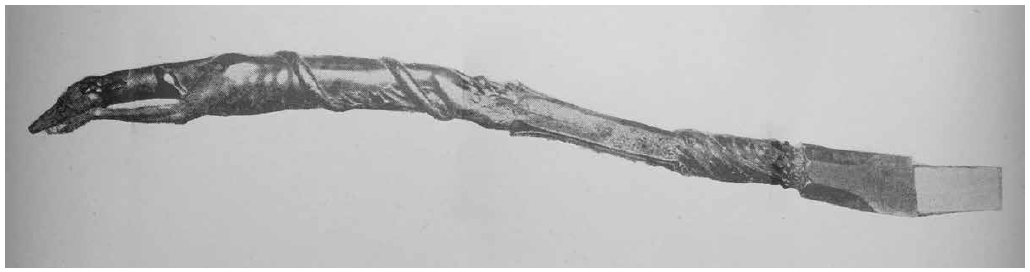 Figura 11 Caña de timón. Fotografía de Raúl Pavón reproducida en la Guía del Museo Arqueológico, Etnográfico e Histórico de Campeche (1942: 73). Pieza que en el presente se exhibe en el Museo de Arqueología Subacuática en el fuerte de San José el Alto, en la ciudad de Campeche.