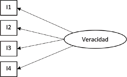 Para evaluar la validez de constructo y confirmar que una sola dimensión era la adecuada para medir veracidad (Figura 1), se utilizó el análisis factorial confirmatorio, por medio del método robusto de estimación de mínimos cuadrados ponderados diagonales (Yang-Wallentin, et al., 2010), a través del paquete lavaan del software estadístico R (versión 4.2.0).