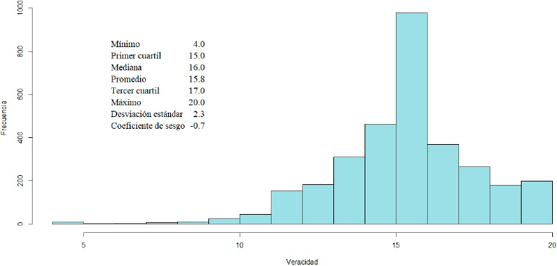 En la Figura 2, se puede observar la distribución de las puntuaciones de la EAV de la muestra en estudio, destacando que en promedio se tuvo una puntuación de 15.8 puntos, lo cual se puede considerar que en las universidades se vive la veracidad; sin embargo, debido a que la distribución presenta un ligero sesgo la izquierda (coeficiente de sesgo de -0.7), es más conveniente describir la tendencia central de las puntuaciones de la EAV a través de la mediana, cuyo valor fue de 16.0 puntos, esto último indica que el 50% de los sujetos en estudio obtuvo 16 puntos o menos y el otro 50% de ellos obtuvo 16 puntos o más.