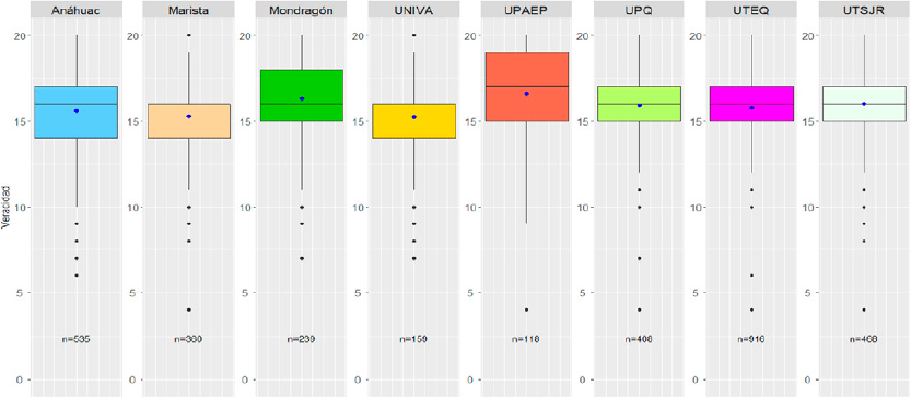 Para analizar la veracidad en universidades a partir de la EAV, adicional a la aplicación llevada a cabo en la UTEQ, se aplicó la EV a una muestra aleatoria de 2,287 integrantes de otras siete universidades de México, teniendo una muestra total de 3,203. De las ocho universidades, siete de ellas están ubicadas en Querétaro: UTEQ, Anáhuac, Universidad Marista de Querétaro (Marista), Mondragón, Universidad del Valle de Atemajac (UNIVA), UPQ, UTSJR; y sólo la UPAEP, se encuentra ubicada en Puebla.