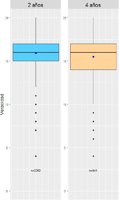 También se compararon las puntuaciones de la EAV por el número de años en la universidad de los sujetos en estudio. Como se observa en la Tabla 6, tanto quienes tienen 2 años, como quienes tienen 4 años en su universidad, tienen la misma mediana (16.0 puntos), aunque en promedio sobresalen los que tienen 2 años; sin embargo, quienes tienen 4 años en su universidad presentan mayor variabilidad (s= 2.4 puntos) que los que tienen 2 años (s= 2.2 puntos), esto último se puede apreciar en la Figura 4.