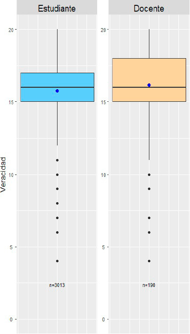 Una vez evaluada la validez y confiabilidad de la EV, se procedió a crear una escala aditiva de la veracidad (EAV) con los cuatro ítems que originalmente conforman la escala. Para ello se realizó una suma algebraica de la puntuación de grado de acuerdo o desacuerdo (1, 2, 3, 4, 5) con cada ítem para cada uno de los individuos en estudio. La puntuación total se entiende como representativa de su posición favorable o desfavorable con respecto a la veracidad. Esta puntuación toma valores enteros que van desde cuatro hasta veinte: a mayor puntuación, mayor manifestación de la virtud de la veracidad; y, por el contrario, a menor puntuación, menor virtud de la veracidad.