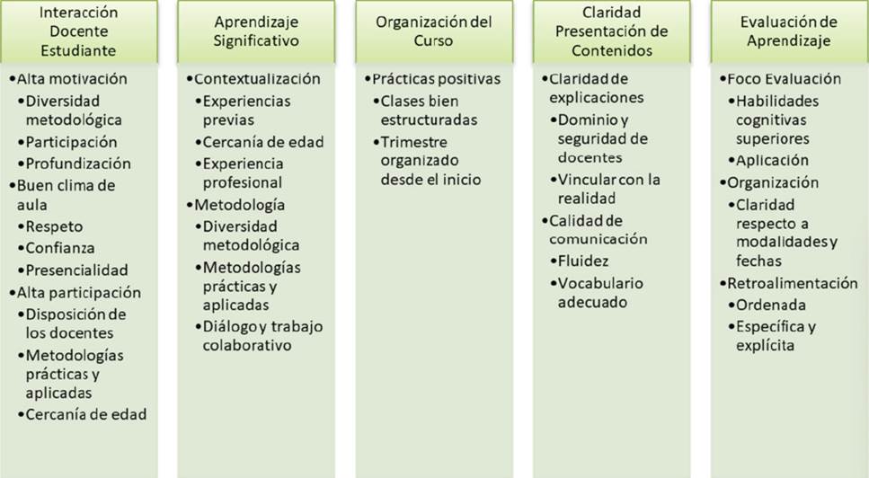 En la literatura revisada se encuentran diversas propuestas de dimensiones que son importantes de analizar para comprender lo que constituye una buena docencia. Si bien existen diversas clasificaciones de dimensiones relevantes al momento de analizar una buena práctica docente (por ejemplo: Biggs, 2006, Fry et al., 2008 y De Vincenzi, 2009) este estudio se ha basado en la propuesta por González et al. (2022), quienes plantean que existe un consenso emergente en que los principales elementos que definen una docencia de calidad son: interacción entre profesores y estudiantes, aprendizaje significativo, organización del curso, claridad en la presentación de los contenidos y las prácticas evaluación de aprendizaje.