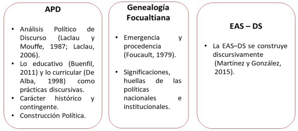 De acuerdo con lo expuesto, se plantea una analítica interdisciplinaria que tiene posicionamientos teóricos, ontológicos y epistémicos, lógicas de razonamiento y técnicas de investigación, dispositivos analíticos e interpretativos, que orientaron la comprensión de las huellas de diversas procedencias y momentos de emergencias que han marcado la estructura curricular del TecNM y sus procesos de articulación discursiva, mediante los que se reconfiguran las significaciones de la EAS y el DS, a partir de negociaciones y pugnas. En el siguiente esquema se presenta la articulación de estos referentes.