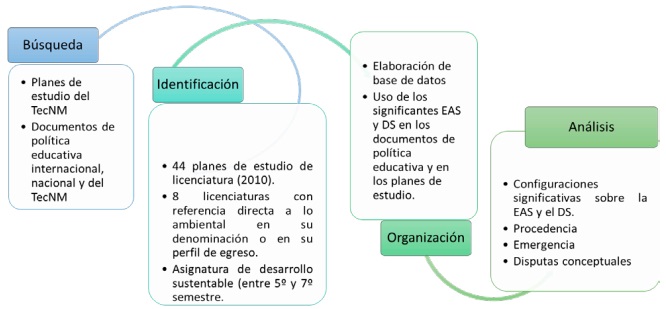 Finalmente, la cuarta fase consistió en el desarrollo de la tarea analítica, sobre la base de la organización realizada en la etapa anterior, que fundamentó el ejercicio interpretativo desde el cual se comprendieron las relaciones entre estos significantes y la construcción de los sentidos de lo ambiental en el discurso curricular del TecNM, para responder a las preguntas de investigación planteadas.