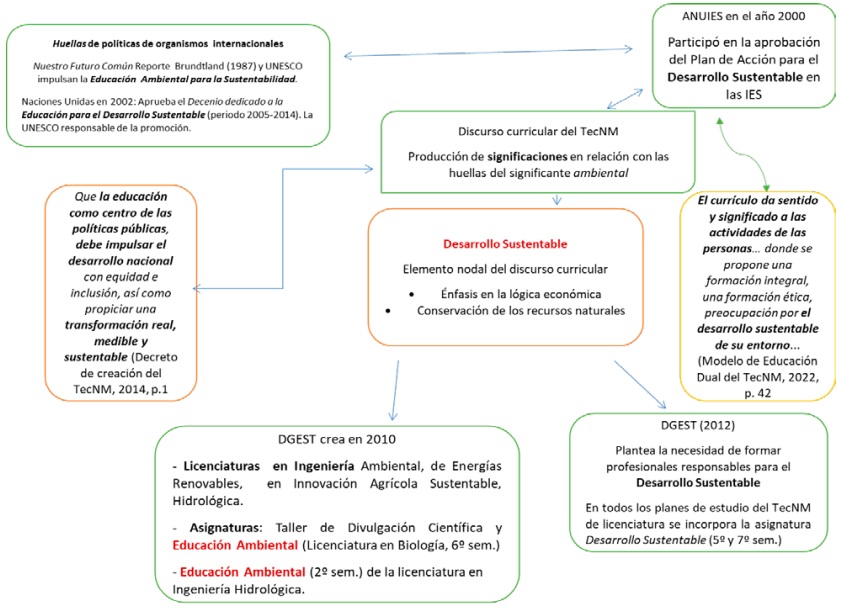 A partir de este posicionamiento se consideró que en el discurso curricular del TecNM se producen tensiones entre los significantes DS y la EAS, que son recuperados de manera histórica y política (mediante conflictos, negociaciones, acuerdos); asimismo, se buscó identificar las huellas de políticas internacionales, nacionales e institucionales de las que proceden los significados sedimentados y hegemónicos desde los que el TecNM ha planteado la incorporación de la preocupación por lo ambiental en sus procesos formativos.