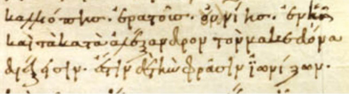 | TRANSCRIPCIÓN DE MARC. GR. Z 450 (A), 100v, col. 1, ll. 14-17 | TRANSCRIPCIÓN DE MARC. GR. Z 451 (Μ), 76r, ll. 8-9 |