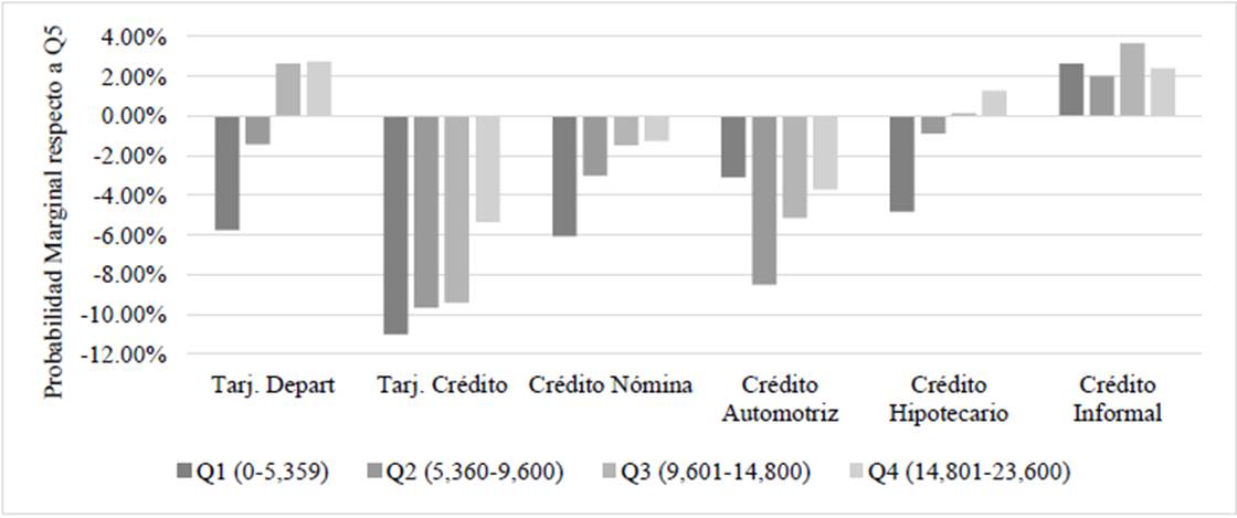 En la figura 1, se muestran las probabilidades marginales para cada tipo de producto financiero para los distintos quintiles de ingreso, permitiendo analizar el impacto de la heterogeneidad en el ingreso sobre el acceso de los hogares a distintos medios de crédito para satisfacer sus necesidades de consumo. Este gráfico analiza las seis categorías de crédito respecto a cuatro categorías de ingreso y comparando con los hogares más ricos (quinto quintil de ingreso).
