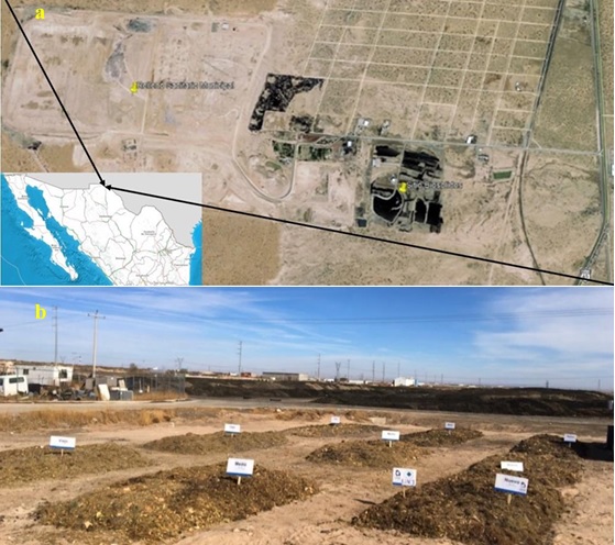 El área de disposición de lodos residuales en Ciudad Juárez, Chihuahua, tiene 15 ha que corresponde a un lecho de secado localizado a 31° 33’ 11.6” N y a los 106° 28´ 44.5” O, altitud promedio de 1232 metros de altitud, y está ubicado junto al relleno sanitario municipal (Figura 1). Los lodos residuales son producidos mediante digestión anaeróbica y resultan con 70 a 75% de humedad al momento de su traslado al lecho de secado, el cual se localiza en el km 30 de la carretera Juárez-Chihuahua. Dentro de la citada área, se asignaron 5 000 m2 para establecer el experimento con las pilas de tratamientos para evaluar el compostaje de lodos residuales que cumplen con los lineamientos de la Norma: NOM-004-SEMARNAT-2002. SEMARNAT, 2002 tanto en términos de metales pesados como de parámetros microbiológicos.