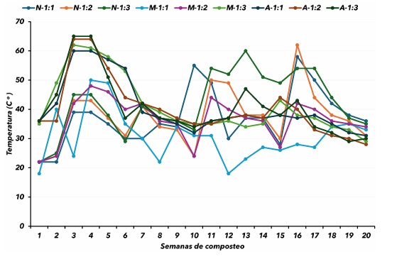 Las temperaturas mayores observadas fueron de 65 oC y se registraron en los tratamientos con lodo apilado (> 12 meses) y la relación lodo/vegetal (1:2 y 1:3) a partir de la tercera semana de compostaje (Figura 2). Esta reacción de aumento en la temperatura fue consistente en los lodos medios y apilados en ese período de tres a cuatro semanas, lo cual coincide con la más alta relación C:N de 28:1 inicial de estos materiales, lo que promueve la acción microbiana para descomposición del material orgánico al aportarse más carbono en este proceso biológico (Cuadro 1). Estudios similares han mostrado temperaturas máxima promedio de 52.5 °C en compostaje de lodos lo que elimina coliformes fecales (Vicencio-De La Rosa, Pérez, Medina y Martínez, 2011). En esta fase del compostaje, los microorganismos utilizan las fuentes sencillas de C y N al generar calor (Román et al., 2013). En este experimento se observaron dos fases termofílicas, en las semanas 3 a 5 para los tratamientos con lodo medio (2 a 12 meses) y apilado (>12 meses), mientras que para lodo nuevo (<1 mes) las temperaturas mayores se registraron en la semana 10 a 12 de compostaje para los tratamientos de menor relación C/N (20:1) que fue para el lodo nuevo. El contenido alto de humedad (75%) en este tipo de lodo no permitió mayor actividad microbiana en las primeras cuatro semanas. Después de la semana ocho, la temperatura de las pilas con lodo medio y apilado fue cercana a la temperatura ambiente del verano que fueron entre 30 y 40 °C para la región norte de Chihuahua. En este proceso de compostaje ocurren tres fases según la temperatura de la pila, fase mesófila donde la temperatura aumenta hasta los 45 °C, aquí ocurre la descomposición de compuestos solubles como azúcares, produce ácidos orgánicos y el pH puede bajar en las primeras dos semanas. La siguiente es la fase termófila o de higienización, es cuando el material alcanza temperaturas mayores a 45 °C, los microorganismos mesófilos son reemplazados por bacterias termófilas que actúan degradando materiales orgánicos más complejos de C como celulosa y lignina. Así, el N se transforma en amoniaco y el pH sube a partir de los 60 °C. Este calor destruye bacterias de origen fecal como Escherichia coli y Salmonella spp., así como quistes y huevos de helminto, esporas de hongos y semillas de malezas. La tercera fase o fase de enfriamiento o mesófila II, al agotarse las fuentes de C y N en el material de compostaje, la temperatura desciende a 40-45 °C, pero continua la degradación de polímeros como la celulosa y el pH desciende un poco, aunque se mantiene ligeramente alcalino. Finalmente, existe una fase de maduración de la composta que demora meses y existen reacciones de condensación y polimerización de compuestos carbonatados para la formación de ácidos húmicos y fúlvicos (Román et al., 2013; Orozco-Almanza, 2014).