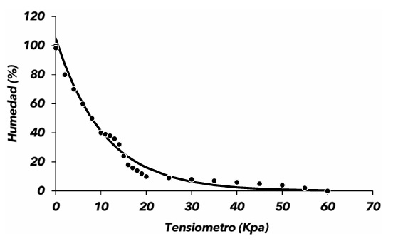 El contenido de humedad en las pilas de compostaje se monitoreo utilizando un tensiómetro marca Irrometer de 30 cm (irrometer.com) al obtener la tensión de humedad en kPa, estas fueron convertidas a porcentaje de humedad volumétrica al utilizar un equipo TDR (Soilmoisture, 2012) en laboratorio para los lodos residuales en promedio como se muestra en la Figura 3. Los registros de temperatura se llevaron a cabo con termómetros marca Oremor de 1 m de longitud (Oremor, 2024), los cuales se insertaron en las pilas de compostas entre tres a cinco minutos hasta obtener lecturas estables. La concentración de oxígeno para monitorear la aireación de las pilas en compostaje se realizó cada semana con un equipo marca Oxytemp-ReoTemp (Reotemp, 2024) que tuvo una longitud de tallo de 0.9 m, el cual se insertó por triplicado en cada pila para obtener una apropiada estimación de esta variable.