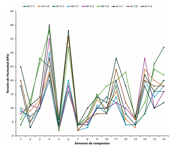El contenido de humedad en las pilas de compostaje vario a lo largo del estudio, debido a los riegos y ocurrencia de precipitaciones pluviales en el área, y volteo de pilas para aireación, sin embargo, en lo general, las pilas estuvieron en el rango óptimo de humedad para compostaje que fue entre 45 y 60%, es decir 20 a 10 kPa (Figura 3 y 4). Una observación consistente en el estudio fue que a mayor cantidad de lodo residual en los tratamientos de compostaje, se conservó más humedad, es decir las relación lodo:vegetal de 1:3 perdía más humedad entre riegos. Esto puede explicarse por la estructura física de los lodos al ser muy pegajosos y retener más humedad en sus estructuras internas.