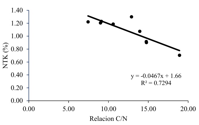 Al comparar las relaciones C/N de los materiales al inicio (Cuadro 1) y final (Cuadro 7) del proceso de compostaje se estimó una reducción de 27.8%, 21.4% y 14.4% en el contenido de C orgánico para los lodos nuevo, medio y apilado, respectivamente, lo cual indica una mineralización de la materia orgánica de 72, 63 y 49%, respectivamente, durante el periodo del compostaje (Cuadro 8). Estos cambios resultan evidentes al considerar que los lodos nuevos o frescos contienen más materia orgánica que los demás tipos de lodos residuales por descomposición natural al estar apilados por largos periodos de tiempo, así como lo indican Sánchez-Monedero et al. (2001) donde las pérdidas de nitrógeno durante el compostaje dependen de los materiales usados y del pH de las mezclas. Las relaciones C/N de los materiales estuvo entre 2.8 a 6.4 para lodos residuales y 38 a 42 para los materiales vegetales, lo cual da una combinación C/N de 20:1 a 25:1 en las mezclas de lodos y vegetal, lo cual es un rango ideal de comienzo del proceso de compostaje (Román et al., 2013). Se puede observar que los lodos residuales aportan más nitrógeno, mientras que los residuos de plantas aportan más carbono. Lin et al. (2022) encontraron en lodo residual compostado un contenido de nitrógeno de 1.7 a 4.7%, mientras que la relación C/N fue entre 11.3 y 11.5. Se detecto una correlación significativa inversa entre el NTK y la relación C/N (Figura 6). Con base en la información anterior donde al comienzo del compostaje se tuvieron relaciones C/N estimadas entre 16:1 y 32:1, estas se redujeron durante la fase termofílica que ocurrió entre las 4ª. y 6ª. semanas de composteo, y así fueron disminuyendo hasta el final del compostaje al contener relaciones C/N entre 9:1 y 16:1, la cual es ideal para una composta madura que se lleva entre tres y seis meses (NOM-NMX-AA-180-SCFI-2018, 2018).