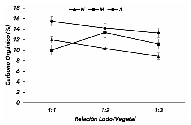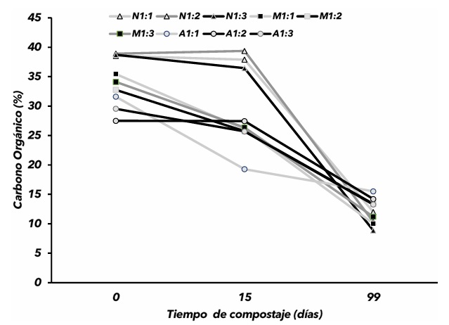 El contenido de carbono orgánico se redujo conforme el tiempo de compostaje para todas las combinaciones de proporciones evaluadas con lodo residual y material vegetal (Figura 3). La disminución promedio del carbono orgánico como producto del proceso de mineralización de la materia orgánica en estos materiales fue que cuando se utilizó el lodo nuevo, éste presentó una reducción de 28.3% en su contenido de carbono lo que representó 73.1±2.38%, mientras que en el lodo medio disminuyó 22.6%, es decir 66.0±3.66%, mientras que el contenido de carbono disminuyó en 15.2% en el lodo apilado lo que representó 51.4±1.95% de reducción a los 99 días de compostaje aérobico. En promedio, el lodo viejo mostró menor reducción para las tres combinaciones de lodo residual y material vegetal evaluados en este estudio (Figura 7).