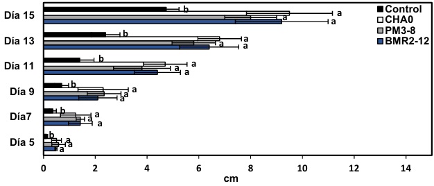 La aplicación de las rizobacterias promovió un desarrollo del sistema radicular en semillas de Oryza sativa L durante 15 DDT en comparación al control (Figura 1). Se demostró que el último día de evaluación, P. protegens CHA0 y A. calcoaceticus BM 2-12 incrementaron la longitud de la radícula (9.5 y 9.2 cm). Esto demuestra una mayor eficiencia en el proceso de germinación e incremento en longitud radicular. Esto coincide con los resultados de Rajer et al. (2022), quienes observaron que la inoculación de Pseudomonas spp. en semillas de arroz incrementó la velocidad de germinación y el vigor en plántulas, puesto que las bacterias promotoras del crecimiento de las plantas presentan un proceso acelerado de germinación mediante la producción de AIA (Ácido indol-3-acético). Castro, Inguanzo, del Monte y Badía (2019) y Jayaro, Ramírez, Hernández y Hernández (2020); aseveran que el AIA está involucrado en el crecimiento y desarrollo de las plantas, principalmente en una serie de procesos fisiológicos que incluyen el alargamiento y división celular, diferenciación de tejido, fototropismo, gravitropismo y en respuestas defensivas (Oliva-Hernández et al., 2021).