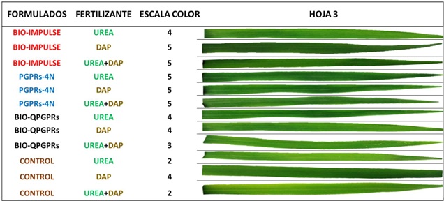 Los valores colorimétricos de la tabla LCC evidenciaron diferencias visuales dentro de cada tratamiento con sus respectivas interacciones (Figura 2). Las aplicaciones de PGPRs-4N con UREA, DAP, UREA + DAP y BIO-IMPULSE DAP y UREA+DAP mostraron mayor intensidad de color (5). Esto coincide con Melati, Sugiyanta y Evarist (2020) que demostraron que la aplicación de rizobacterias en la fertilización química (NPK + Urea) aumentó la escala de color en comparación al tratamiento sin aplicación. Esto evidencia una mayor eficiencia de fertilizante en el área foliar, además de la adaptabilidad de estos formulados en los suelos para cumplir sus actividades de solubilización en el suelo.