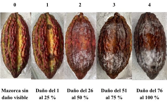 Severidad de la enfermedad. La severidad se calculó utilizando una escala arbitraria que estima el porcentaje de daño de la mazorca de cacao (Figura 1).