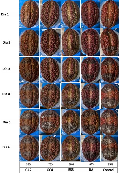 Los resultados obtenidos durante el periodo de observación revelaron una inhibición significativa en la progresión de la enfermedad en las mazorcas tratadas, con una reducción de la severidad de hasta el 55%, con la cepa GC2, al sexto día post-inoculación, en contraste con el grupo control donde la severidad superó el 83%. Esta marcada disminución sugiere un efecto inhibitorio consistente de las cepas de actinomicetos evaluadas sobre el patógeno Phytophthora palmivora, en este sentido, Nysanth et al. (2022) demostraron la capacidad de actinomicetos aislados del suelo de la rizósfera de pimienta negra para controlar Phytophthora palmivora. Los resultados demostraron que varios aislamientos de actinomicetos exhibieron una significativa actividad antifúngica in vitro contra P. palmivora y también mostraron potencial para reducir la incidencia de la pudrición del pie en experimentos in vivo.