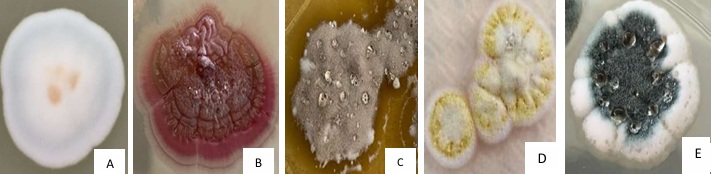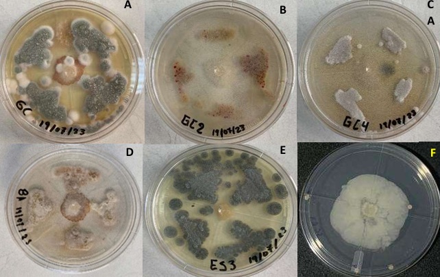 Aislamiento y caracterización de actinomicetos rizosféricos. Se aislaron cinco cepas puras de actinomicetos rizosféricos. Cada cepa de actinomiceto presentó una morfología diferente. Se observó diversidad de pigmentos en las cepas, que van desde blanco, crema, amarillo, marrón, verde, etc. En cuanto a la textura, presentaron características propias de actinomicetos como textura seca, polvosa y adheridas al agar (Cuadro 1). Además, hubo cepas con texturas acuosas posiblemente de geosmina (Figura 2). Adicionalmente, mediante la caracterización bioquímica, todas las cepas fueron Gram positivas y presentaron la capacidad de hidrolizar el peróxido de hidrógeno (catalasa positiva).