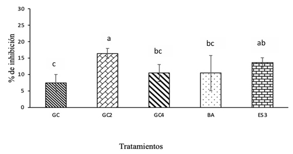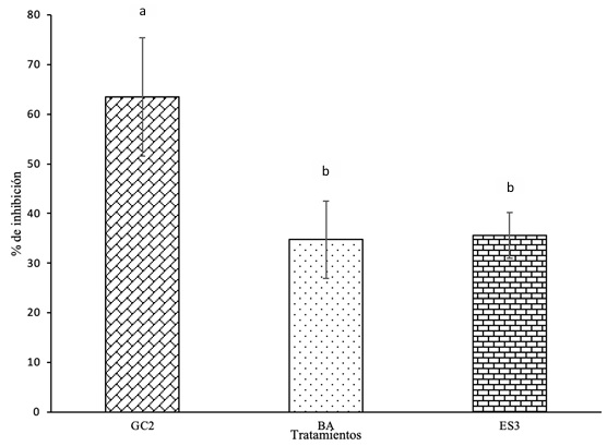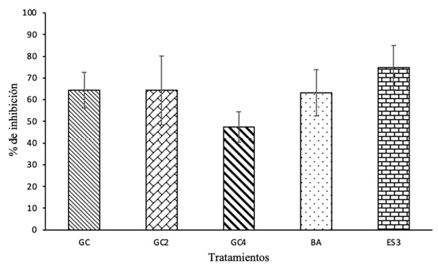 Efecto antagonista in vitro de los metabolitos de los actinomicetos sobre P. palmivora. Con los metabolitos obtenidos de los actinomicetos rizosféricos se observaron diferencias significativas entre los tratamientos (Figura 3). Todos los tratamientos reflejaron inhibición de P. palmivora respecto a la media, sobresaliendo el tratamiento GC2 (16.42 %) y ES3 (13.67 %) a diferencia del resto de las cepas. Las cinco cepas de actinomicetos (cepa ES3, cepa GC4, cepa GC, cepa GC2, cepa BA) presentaron antagonismo frente a P. palmivora mostrando mayor inhibición del crecimiento con respecto al control, donde se observó que el crecimiento del micelio del hongo disminuyó respecto al grupo control (Figura 4).
