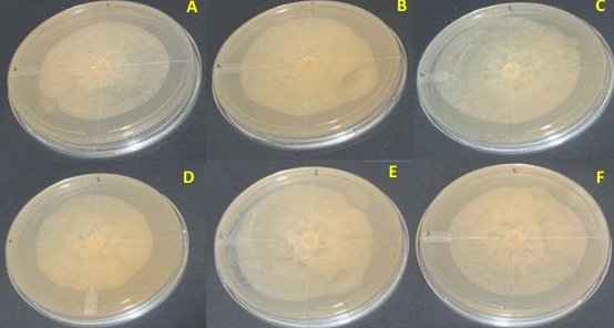 Antagonismo in vitro de los metabolitos de los actinomicetos frente a Phytophthora palmivora. Para este ensayo se obtuvo el extracto celular de cinco cepas de actinomicetos previamente caracterizadas, y se utilizó el medio agar V8 ya que favorece el crecimiento y desarrollo de P. palmivora. En el medio de cultivo se sembraron 20 µL de extractos celulares de los actinomicetos, esparcidos por toda la placa, y luego se colocó un tarugo de 5 × 5 mm de P. palmivora en el centro de cada placa. Se evaluó el crecimiento de P. palmivora con relación al control que solo tenía medio con el patógeno por 5 días. Este ensayo también se realizó sumergiendo pequeños discos de papel filtro de 5 mm por 20 s en el extracto celular de cada cepa, cuatro discos por tratamiento. Seguidamente, se colocó a P. palmivora en los cuatros puntos cardinales de la placa y en el centro.