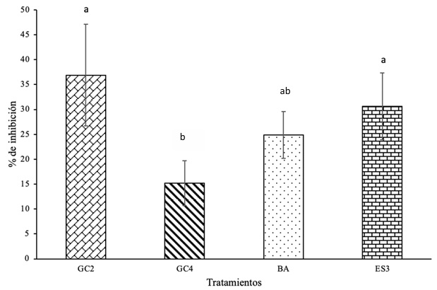 Figura 7: Porcentaje (%) de inhibición de los metabolitos de actinomicetos frente a Phytophthora palmivora en mazorcas de cacao CCN-51 evaluadas a los 4 días. Las barras de error indican ± desviación estándar; diferentes letras indican diferencias significativas entre los promedios a P < 0.05 (test de Duncan).