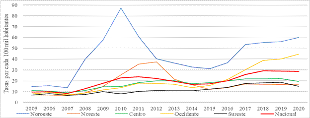 Figura 1 Tasas regionales de homicidios en México, 2005-2020