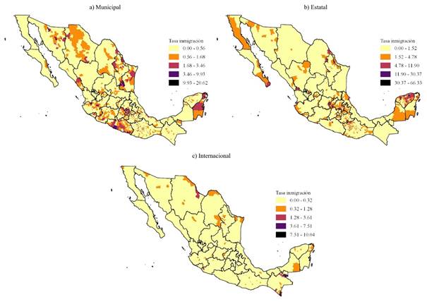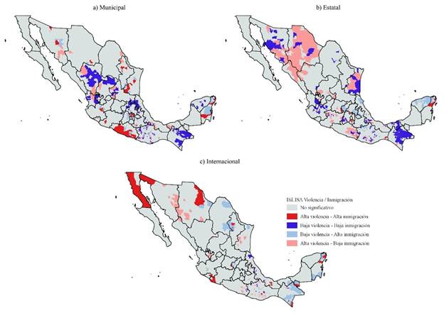 En esta sección, se analiza la distribución espacial de las tasas de migración por inseguridad y violencia, diferenciadas por tipos de migración: municipal, estatal e internacional, así como su correlación espacial con los niveles de violencia de los municipios de destino. En los mapas de la Figura 2 se observa que para el caso de la inmigración municipal las altas tasas se concentran en regiones de la costa de Guerrero, al norte de Colima, en el Valle de México, alrededor de las zonas metropolitanas de Guadalajara y Monterrey, cerca de Mazatlán en Sinaloa, al centro de Sonora, al sur de Chihuahua, al norte y sur de Tamaulipas, y al centro y norte de Quintana Roo, y cuya concentración puede deberse a la preferencia por zonas urbanas y capitales de las entidades, así como al incremento de la violencia e inseguridad experimentado en años recientes por algunas de estas entidades del país.