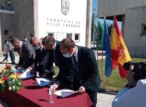 Pronto se retomaron las conversaciones y se fijó la reunión en la vieja aduana, con las preceptivas y necesarias medidas de seguridad sanitarias, de los alcaldes de Almeida (Antonio Machado), Vilar Formoso (Manuel Gomes), Fuentes de Oñoro (Isidoro J. Alanís) y Ciudad Rodrigo (Marcos Iglesias) para la firma de la propuesta de convenio y de los estatutos de la eurociudad bajo la figura legal de AECT y con la denominación de Puerta de Europa (véanse Figura 7 y Figura 8), un nombre que rememora la salida de emigrantes portugueses hacia los países allende los Pirineos y la entrada de mercancías procedentes de Europa.
