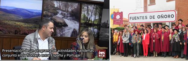 Figura 9 Actividades conjuntas en la eurociudad. Izquierda: El presidente de la Cámara Municipal de Almeida y la alcaldesa de Fuentes de Oñoro en la presentación de “Navidad sin fronteras”. Derecha: XIV Capítulo de la Confraria Gastronómica dos Aromas e Sabores Raianos