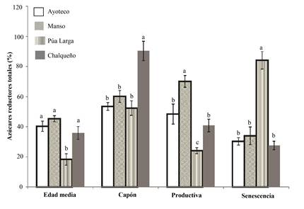 De acuerdo con Mora-López et al. (2011), el inicio del crecimiento del pedúnculo floral indica el cambio fisiológico del maguey de un estado vegetativo a reproductivo, a lo que los productores le denominan “maguey capón”; en esta etapa los fructanos se despolimerizan para proporcionar energía a los órganos reproductores. Esto indica que los mayores niveles de ARD están presentes en la etapa fenológica capón, lo cual es cierto para los cultivares Manso, Púa Larga y Chalqueño y no así para el cultivar Ayoteco, donde se observó su nivel más alto en la etapa productiva. Esto contrasta con el reporte de Aldrete-Herrera et al. (2019), quienes evaluaron la presencia de ARD en pencas de A. salmiana cv. Chino y reportaron que los ARD alcanzaron su máxima concentración en la primera etapa de crecimiento. A la edad de 2-4 años obtuvieron valores de 26.40 g/100 g de agave seco y disminuyeron conforme crecía la planta. A la edad de 10-12 años obtuvieron valores de 13.08 g/100 g de agave seco. Esto sugiere la disposición de azúcares simples para el crecimiento vegetativo de la planta.