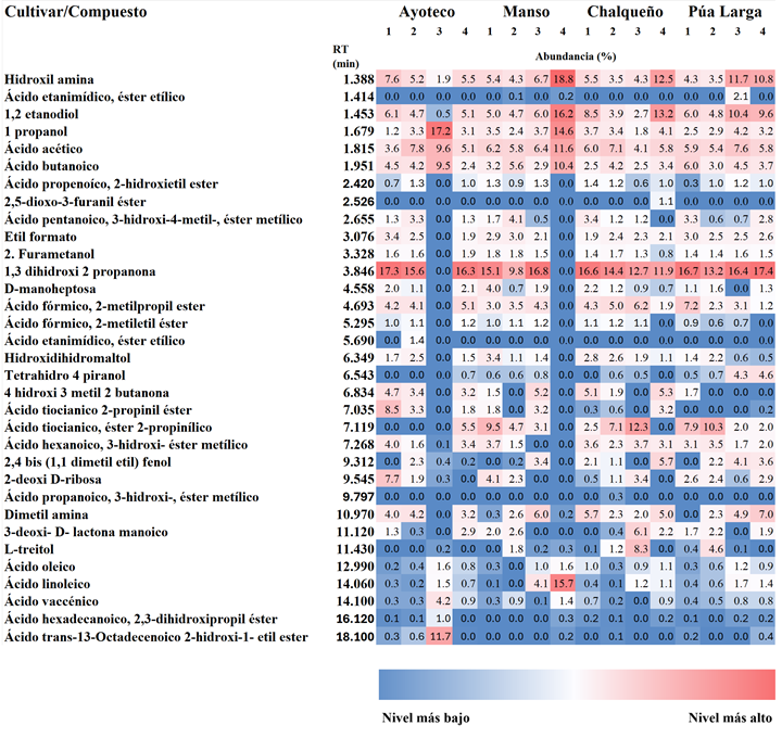 En la Figura 5 se muestran los compuestos identificados por CG-MSD. Mayoritariamente se encontraron ácidos grasos y ésteres, aunque también se identificaron azúcares, alcoholes y ácidos. El ácido oleico estuvo presente en 15 de las 16 muestras, siendo más abundante en los cultivares Manso-senescencia y Ayoteco-senescencia. El ácido linoleico se detectó en 15 de las 16 muestras analizadas, siendo más abundante en el cultivar Manso-senescencia. El ácido vaccénico se encontró en todos los cultivares y etapas fenológicas, excepto en Chalqueño-productiva. De manera adicional algunas muestras presentaron ácido butanoico, acético, D-manoheptosa y L-treitol.