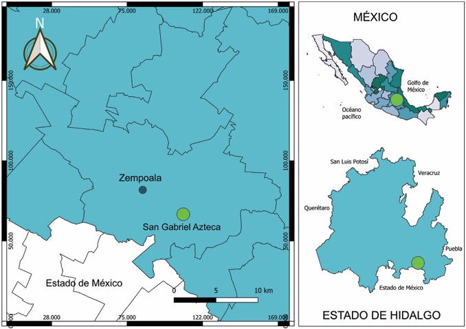 Esta investigación se desarrolló en un matorral xerófilo sarcocaule de la localidad San Gabriel Azteca perteneciente al municipio Zempoala, Hidalgo, México, 98°37'0.90''O, 19°52'45.65''N, 2555 m (Fig. 1); de clima seco templado (BS0kw(x)) con temperatura media anual de entre 12 y 20 °C, régimen de lluvias en verano e invierno (García, 2004). En su composición florística se observa la predominancia de Opuntia streptacantha Lem., con presencia de Senecio inaequidens DC., Zaluzania sp., Flourensia sp., Gymnosperma glutinosum Less., además de Schinus molle L., Agave salmiana Otto ex Salm-Dyck, Yucca filifera Chabaud, Datura stramonium L., Ipomoea stans Cav., Nicotiana glauca Graham, Sphaeralcea angustifolia (Cav.) G. Don. y biznagas entre las que destacan Ferocactus latispinus Britton & Rose, Mammillaria magnimamma Haw., Mammillaria uncinata Zucc. ex Pfeiff y Coryphantha sp. El sitio de estudio es un ecosistema altamente fragmentado utilizado en actividades de ganadería y agricultura de temporal lluvioso (García, 2004; Hornung-Leoni et al., 2021).