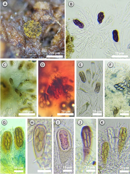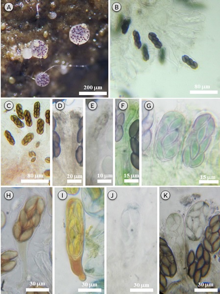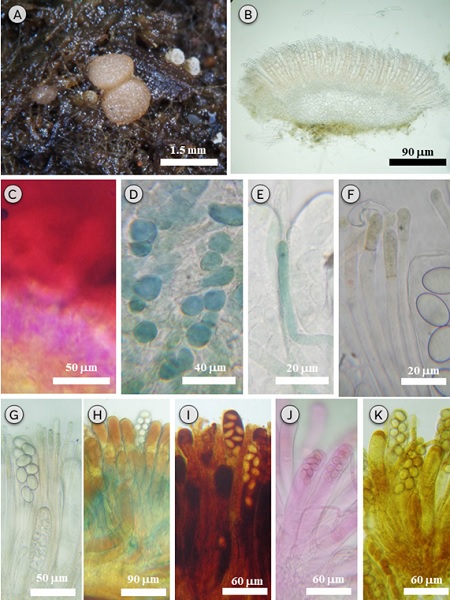 Notas taxonómicas: esta especie se caracteriza por formar apotecios densamente gregarios de color amarillo con la superficie con puntuaciones púrpuras a negra por las ascosporas. Siempre se ha reportado sobre estiércol de caballo y vaca (Dennis, 1981; Giménez et al., 2005).