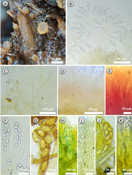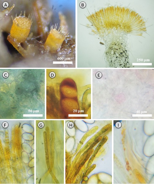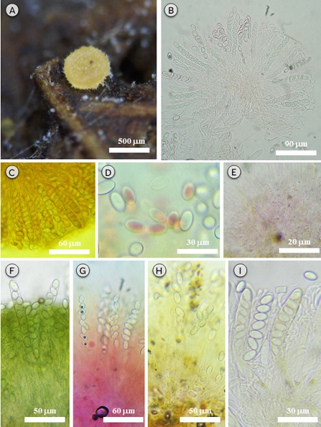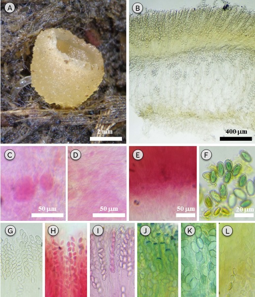 Apotecios 700-900 μm de diámetro, turbinados a globosos, sésiles, pálido amarillento a amarillo sulfuroso (1A5) llegando a ser amarillo brillante (2A5), translucido, superficie himenial de aspecto mucilaginoso con ascas sobresaliendo del himenio, superficie exterior glabra, sin borde; excípulo ectal 300-350 μm de grosor, textura angularis, células angulares 21-45 μmde diámetro, con pared amarillenta, delgada; excípulo medular ausente; subhimenio 48-67 μm de grosor, textura epidermoidea, hifas 5-15 μm de ancho, hialinas; paráfisis 1-2 μm de diámetro, filiformes, septadas, ligeramente ensanchadas hacia el ápice, con pequeñas gútulas hialinas, se curvan formando una red entre las ascas, con una capa mucilaginosa extracelular de color amarillo; ascas 220-250 × 60-80 μm, globosas a subglobosas, con opérculo inamiloide, pared amiloide cuando jóvenes, 1 μm de grosor, octospóricas; ascosporas (47)49-53(54) × 25-30 μm, elipsoides, violeta a púrpura en agua destilada, marrón en KOH, con pared delgada y lisa, rodeadas por una capa mucilaginosa, desordenadas en el citoplasma del asca.