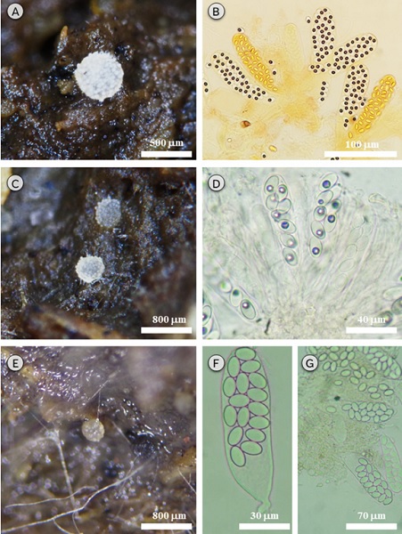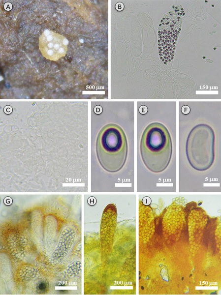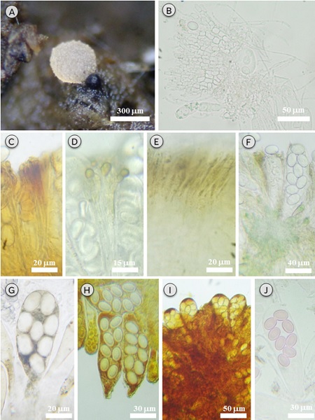 Apotecios 200-500 μm de diámetro, pulvinados, sésiles, blancos (1A1); superficie himenial granulosa por las ascas que sobresalen del himenio, hialino; superficie exterior lisa, color blanco a marrón claro con la madurez, sin borde; excípulo ectal 80-110 μm de grosor, textura angularis a epidermoidea con hifas globosas a subglobosas 8-14 μm de diámetro, la última capa de células más alargadas, pared delgada y lisa, hialinas; excípulo medular y subhimenio indiferenciado; paráfisis 3-4 μm de diámetro, filiformes, capitadas, ligeramente curvadas, septadas, con gútulas de diferentes tamaños, hialinas, formando una red alrededor de las ascas; ascas 45-60 × 20-28 μm, globosas a subglobosas, con opérculo y pared inamiloide, biseriadas, octospóricas; ascosporas 13-16 × 9-11 μm, subglobosas, pálido amarillentas a verdosas, con pared delgada y lisa, generalmente con burbuja de Bary, 4-5 μm de diámetro.