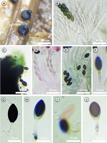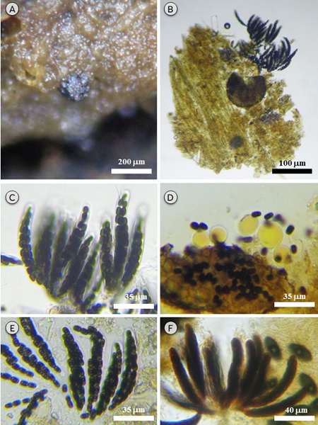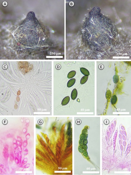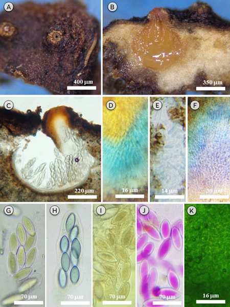 Pseudotecios 470-690 × 250-280 μm, piriformes, subglobosos, coriáceos, inmersos en el sustrato, sobresale un cuello de 150-200 × 50-70 μm que se alarga a 300-350 μm en ejemplares maduros, gregarios, negros (2F1); peridio liso, 7-10 μm de grosor, textura intrincata, hifas 3-5 μm de diámetro, marrón claro con paredes engrosadas de color marrón oscuro; subhimenio muy escaso formado por algunas hifas epidermoides, 5-10 μm de grosor, hialinas, conteniendo gútulas de distintos tamaños; pseudoparáfísis de hasta 1 μm de diámetro, filiformes, ramificadas, hialinas con gútulas de distintos tamaños distribuidas de forma irregular; ascas bitunicadas, 72-137 × 7-10 μm, cilíndricas, hialinas, inamiloides, uniseriadas, octospóricas; ascosporas, 11-13 × 5-6 μm, elipsoides, bicelulares, células distal y proximal idénticas, 5-6 μm de diámetro, cónicas, sin apéndices gelatinosos, con burbuja, 3-4 μm de diámetro, marrón oscuro de paredes engrosadas de hasta 1 μm de grosor, línea germinal oblicua.