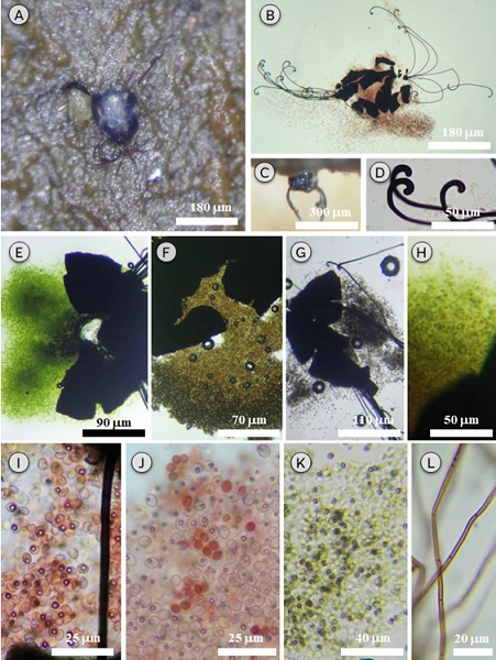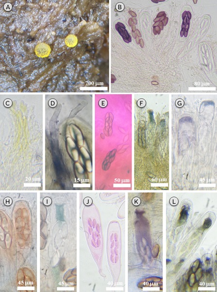 Figura 8: Saccobolus glaber (Pers.) Lambotte. A. apotecios; B. corte longitudinal del apotecio; C. paráfisis en agua destilada; D. paráfisis en reactivo de sulfuro de cobre; E. ascas y ascosporas en vainillina sulfúrica; F. ascas y ascosporas en cloruro férrico sulfúrico; G. ascas en reactivo de Liebermann; H. ascas en KOH; I. ascas en reactivo de Marquis; J. ascas y ascosporas en reacción PAS; K. ascas en reactivo de Jeffrey; L. ascas y ascosporas en reactivo de sulfuro de cobre. P. M. Alvarez-Cortés 335 (ENCB).