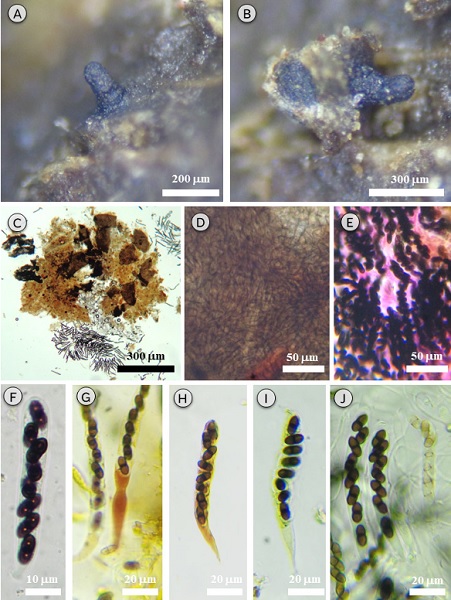 Figura 2: Delitschia marchalii Berl. & Voglino. A-B. pseudotecio; C. pseudotecio disgregado; D. detalle del peridio con textura intrincata; E. ascas en reactivo de vainillina sulfúrica; F. asca en agua destilada; G-H. ascas en reactivo de Dragendorff; I. ascas en reactivo de azul de bromofenol; J. ascas y ascosporas. P. M. Alvarez-Cortés 472 (ENCB).