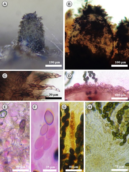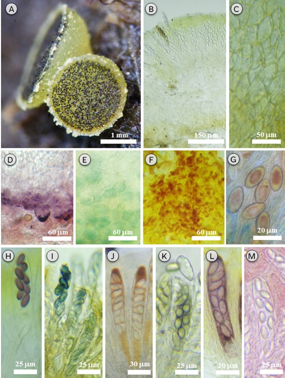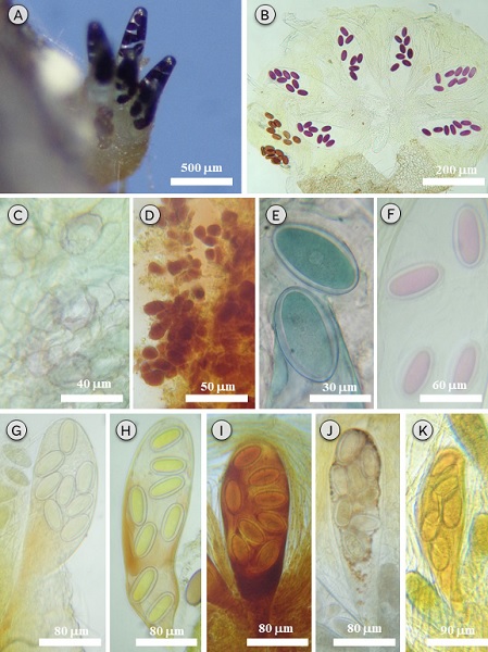 Para su análisis micromorfológico se realizaron cortes longitudinales de los ascomas montados en preparaciones temporales con KOH al 5% en agua y solución de glicerina-agua al 50% con 1% de fenol siguiendo en parte el protocolo de Bezerra y Kimbrough (1975). Se describieron los caracteres morfológicos de los ascomas, tamaño, forma, ornamentación y registro del color del ascoma utilizando la carta de colores de Kornerup y Wanscher (1978). De las paredes hifales y de los excípulos medular o ectal, se registró su grosor, textura, tipo y tamaño y color de las células. De los elementos del himenio como pseudoparáfisis, paráfisis, ascas y ascosporas se indica el tamaño, forma, color y ornamentación.