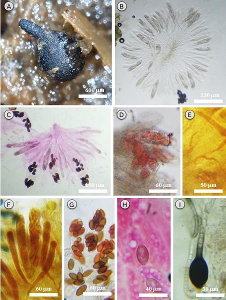 Pseudotecios 170-210 μm de diámetro, piriformes, coriáceos, inmersos en el sustrato, sobresaliendo solo el cuello, hasta 60 μm de largo, gregarios, color marrón obscuro (5F8) a negro (2F1); peridio, 5-15 μm de grosor, textura angularis con células angulares de paredes gruesas; subhimenio, 10-30 μm de grosor, textura epidermoidea con hifas epidermoides, 4-10 μm de diámetro, hialinas con pared delgada y lisa; pseudoparáfisis, 1-2 μm de diámetro, filiformes, hialinas; ascas bitúnicadas, 170-200 × 21-33 μm, claviformes, hialinas, uniseriadas a biseriadas al madurar, octospóricas; ascosporas, 51-57 × 9-11(12) μm, marrón obscuro, tetracelulares con hifas individuales, 12-15(16) × 9-11(12) μm con una gran gútula, 7-9 μm de diámetro, línea germinal sigmoide.