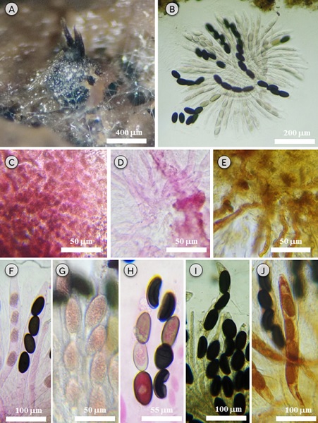 Pseudotecio, 80-150 μm de diámetro, piriformes, inmersos a subinmersos en el sustrato, coriáceos, marrón obscuro (5F8) a negro (2F1); peridio, 5-11 μm de grosor, textura angularis, hifas (6)11-16 × 10-21 (5), de paredes engrosadas amarillentas con citoplasma marrón claro; pseudoparafisis, filiformes, hialinas; ascas bitúnicadas, 80-90 × 13-16 μm, que se expanden en la madurez alcanzando hasta 150 μm, clavadas, hialinas, uniseriadas, octospóricas; ascosporas, 34-38 × 4-6 μm, tetracelulares que fácilmente se fragmentan en dos paquetes bicelulares, 14-19 × 4-6 μm, marrón oscuro, con una pequeña burbuja central, línea germinal sigmoide.