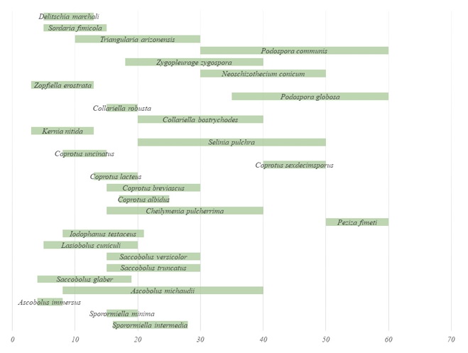 | Sordaria fimicola (Roberge ex Desm.) Ces. & De Not. | X | 10–30 | |||