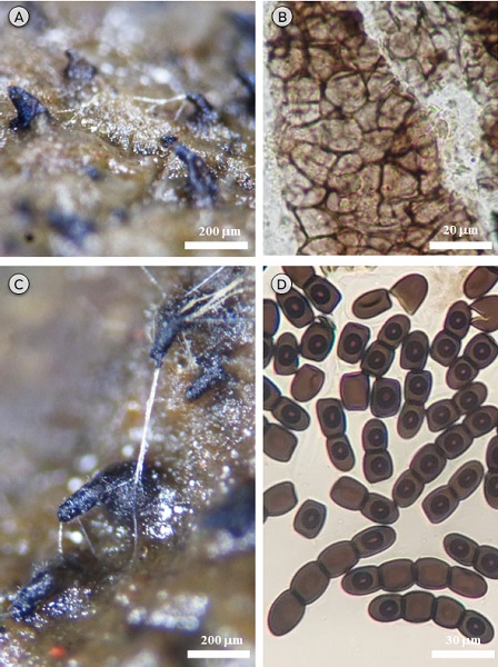 Figura 3: Sporormiella intermedia (Auersw.) S.I. Ahmed & Cain ex Kobayasi. A y C. pseudotecios; B. detalle del peridio con textura angularis; D. ascosporas. P. M. Alvarez-Cortés 339 (ENCB).