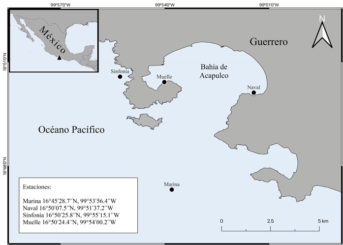 Se seleccionaron cuatro puntos dentro y fuera de la Bahía de Acapulco (Fig. 1). Marina (16°45'28.7''N, 99°53'56.4''W), Naval (16°50'07.5''N, 99°51'37.2''W), Sinfonía 16°50'25.8''N, 99°55'15.1''W) y Muelle (16°50'24.4''N, 99°54'00.2''W). Se realizaron cuatro muestreos entre julio de 2022 y marzo de 2025 (un muestreo por año), utilizando una botella Van Dorn (General Oceanics, Florida, EUA) y concentrando las muestras con un equipo de filtración inversa. Asimismo, durante cada muestreo se realizó un arrastre horizontal en la capa superficial de agua, de 0-30 cm, durante 5 min con red planctónica de 20 μm de apertura de malla. Se fotografiaron pseudocolonias de Polykrikos, usando microscopios ópticos Olympus BX50 (Tokio, Japón) de campo claro y Reichert Microstar IV de contraste de interferencia diferencial (Leica, Vienna, Austria), ambos equipados con objetivos acromáticos y una cámara digital Nikon Z6 de 24 megapíxeles (Tokio, Japón) acoplada. Algunas fotografías fueron tomadas con un apilamiento de enfoques en Helicon Focus (Kharkiv, Ucrania) para tener mayor cantidad de estructuras enfocadas en una misma imagen.