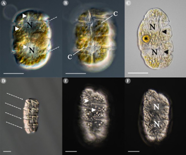 Figura 2: Polykrikos hartmannii W.M.Zimmermann y P. kofoidii Chatton encontrados en la Bahía de Acapulco, México. A. Polykrikos hartmannii, encontrada en marzo de 2023, enfoque a la mitad de la pseudocolonia. Pseudocolonia recta de 2 zooides (flechas punteadas), se observan 2 núcleos (N) y complejos nematocisto-teniocisto (flechas); B. Polykrikos hartmannii, encontrada en julio de 2022 en vista ventral, enfoque en la superficie celular, mostrando numerosos cloroplastos (C); C. vista lateral, se observan 2 zooides y 2 núcleos (N), numerosos cloroplastos, una vacuola de alimento (asterisco), así como complejos nematocisto-teniocisto (flechas); D. pseudocolonia de P. kofoidii, encontrada en abril de 2024, mostrando 4 zooides (flechas punteadas) y ligera torsión hacia la izquierda; E. enfoque a la mitad de la pseudocolonia, mostrando numerosos complejos nematocisto-teniocisto (flechas); F. enfoque en la superficie de la pseudocolonia, se observan 2 núcleos (N) y numerosas gotas de aceite en la superficie celular. Escala: 50 µm.