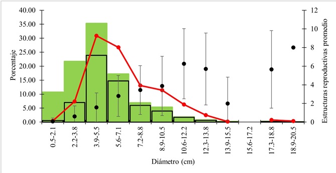 Figura 2: Estructura poblacional de Begonia ostulensis Mart. Gord. & M.F. Ramos. Las barras verdes representan el porcentaje de individuos en cada categoría diamétrica; las barras negras corresponden al porcentaje de individuos reproductivos; la línea representa el porcentaje de estructuras reproductivas y; los puntos representan el número promedio (± DE) de estructuras reproductivas producidas por individuo.