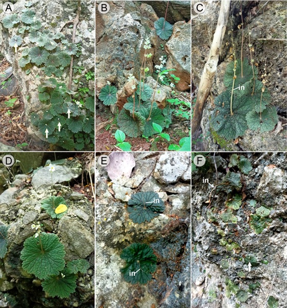Figura. 4: Etapas fenológicas de Begonia ostulensis Mart. Gord. & M.F. Ramos en los años 2022 (A-C) y 2023 (D-F). Inicio de la floración en la primera semana de julio 2022 (A), las hojas presentan un botón floral blanco (flechas) indicando que la inflorescencia comienza a elongarse; apariencia de julio a septiembre de 2022 (B) con inflorescencias en distintas etapas de desarrollo; apariencia en octubre de 2022 (C) con infrutescencias (in) turgentes y erguidas; floración en julio 2023 (D); apariencia en septiembre 2023 (D-E) con infrutescencias y/o inflorescencias secas.